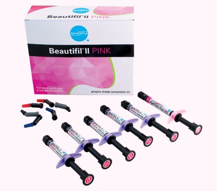 Los tonos Beautifil II Gingiva de Shofu, con la tecnología patentada bioactiva Giomer, están destinados al área cervical, específicamente: la corrección estética de la recesión gingival, defectos en forma de cuña, áreas cervicales expuestas, entablillado y reequilibrio de la estética rosa. Los compuestos de resina Beautifil II Gingiva se pueden mezclar y colocar en capas para producir tonos personalizados que ayudarán a abordar eficazmente las necesidades clínicas del paciente.